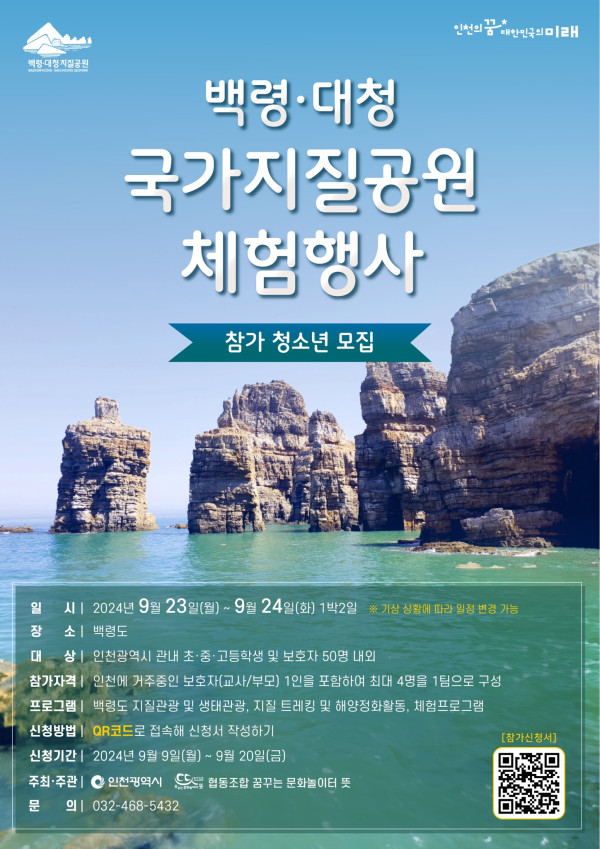 2024년 백령대청 국가지질공원 체험행사 참가 청소년 모집 안내 BD Geopark 2024-09-12 BD Geopark 0 2049 2024.09.12 09:40 2024년 백령대청 국가지질공원 체험행사 참가자를 모집하오니, 많은 참여 부탁드립니다.